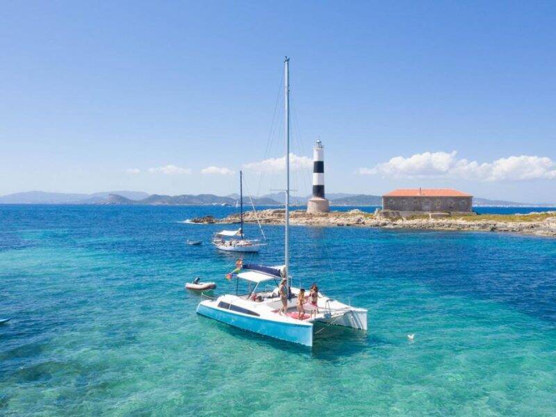Este pequeño catamarán es perfecto para una excursión en familia. Al ser muy ligero y contar con una excelente superficie vélica, es una embarcación muy agradable para pasar un día en Formentera. En la proa dispone de una amplia red donde relajarse y tumbarse al sol, y en la popa ofrece un gran espacio con una magnífica zona de sombra con capacidad para hasta 8 personas. El catamarán navega de forma suave y, gracias a su tamaño reducido, puede acceder a pequeñas calas y playas a las que no llegan embarcaciones de mayor tamaño.